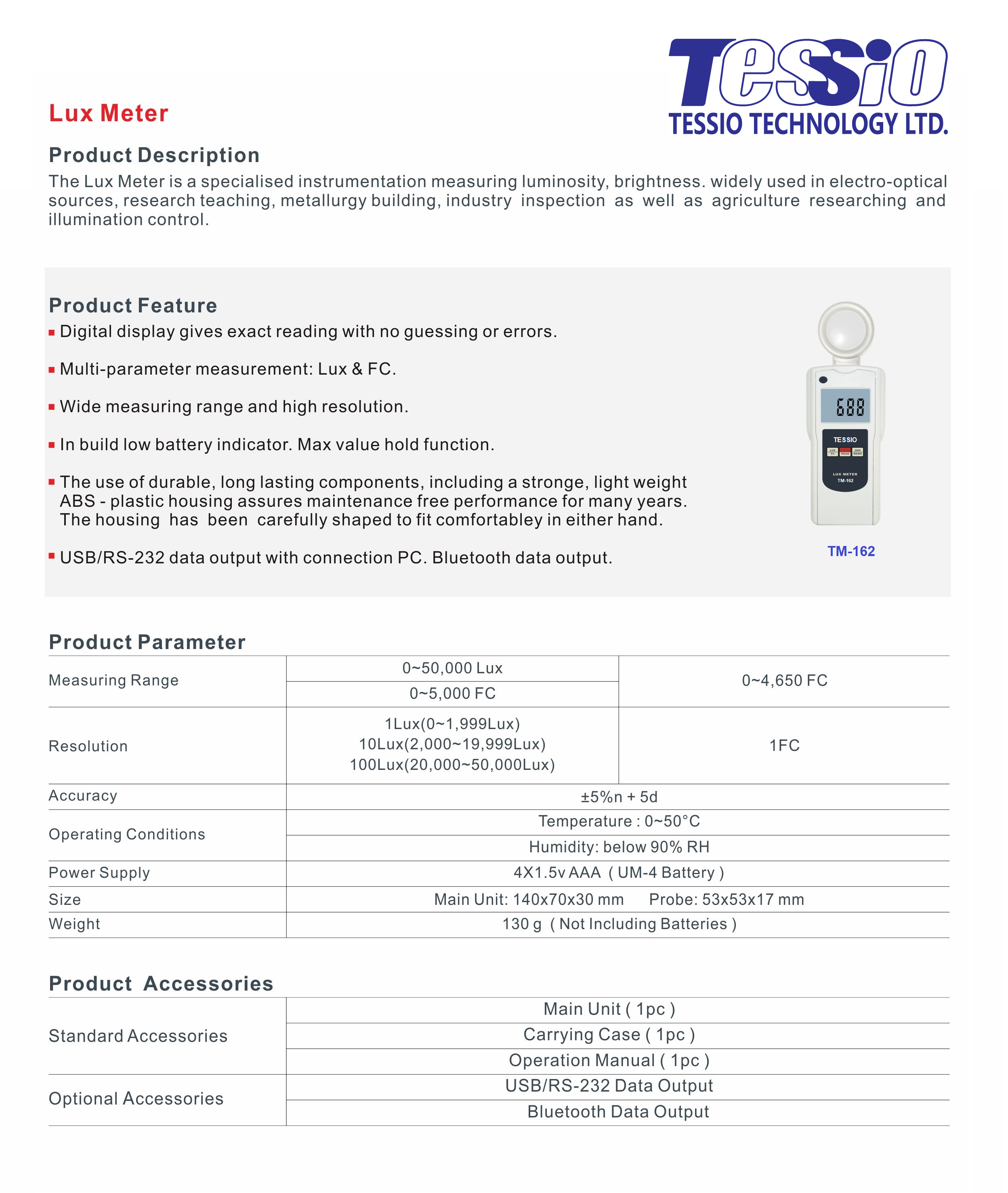เครื่องวัดแสง พร้อมต่อผ่าน Bluetooth หรือ USB LUX/ FC Meter with Bluetooth or USB interface TM-160 Series ประกอบด้วยรุ่นดังต่อไปนี้